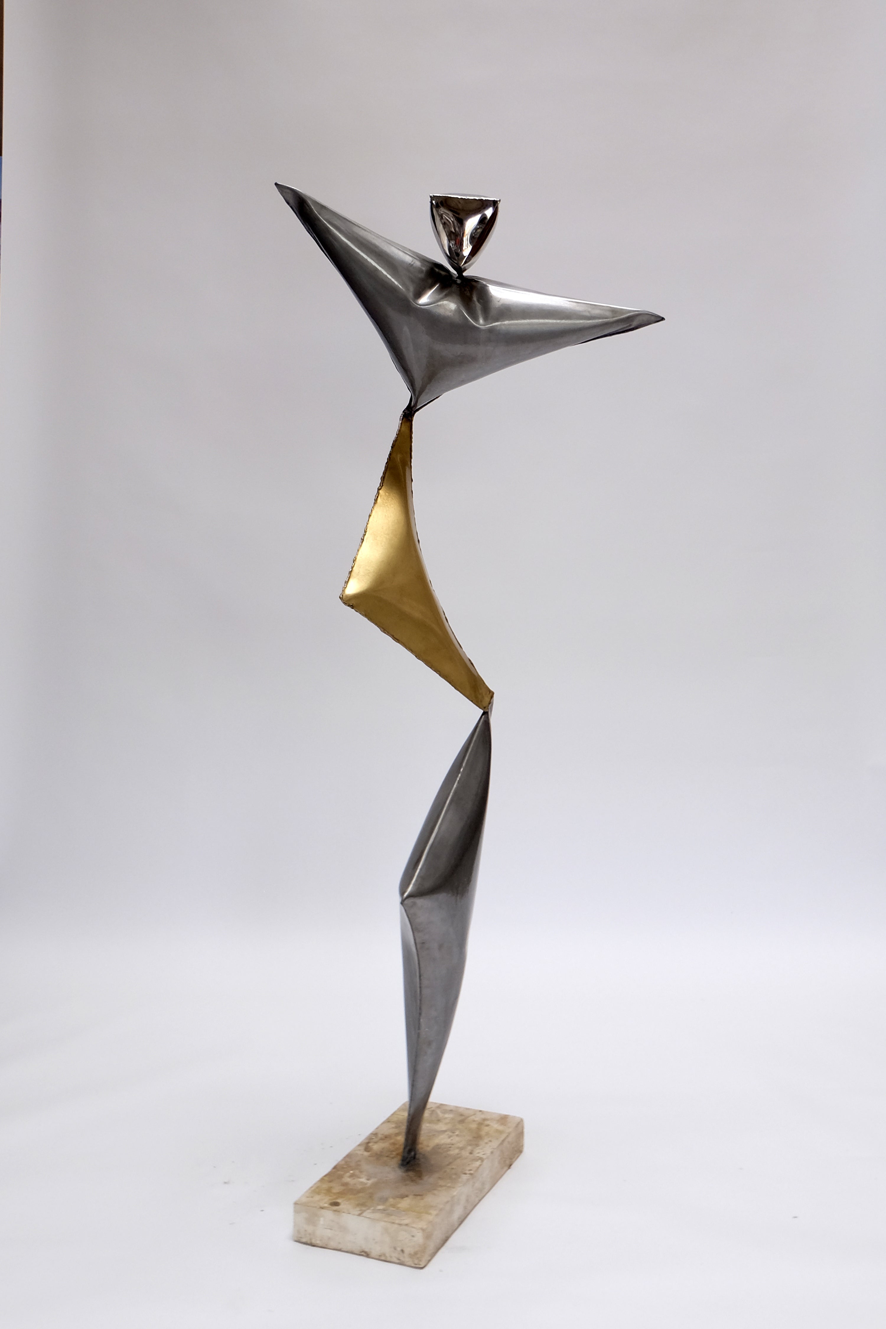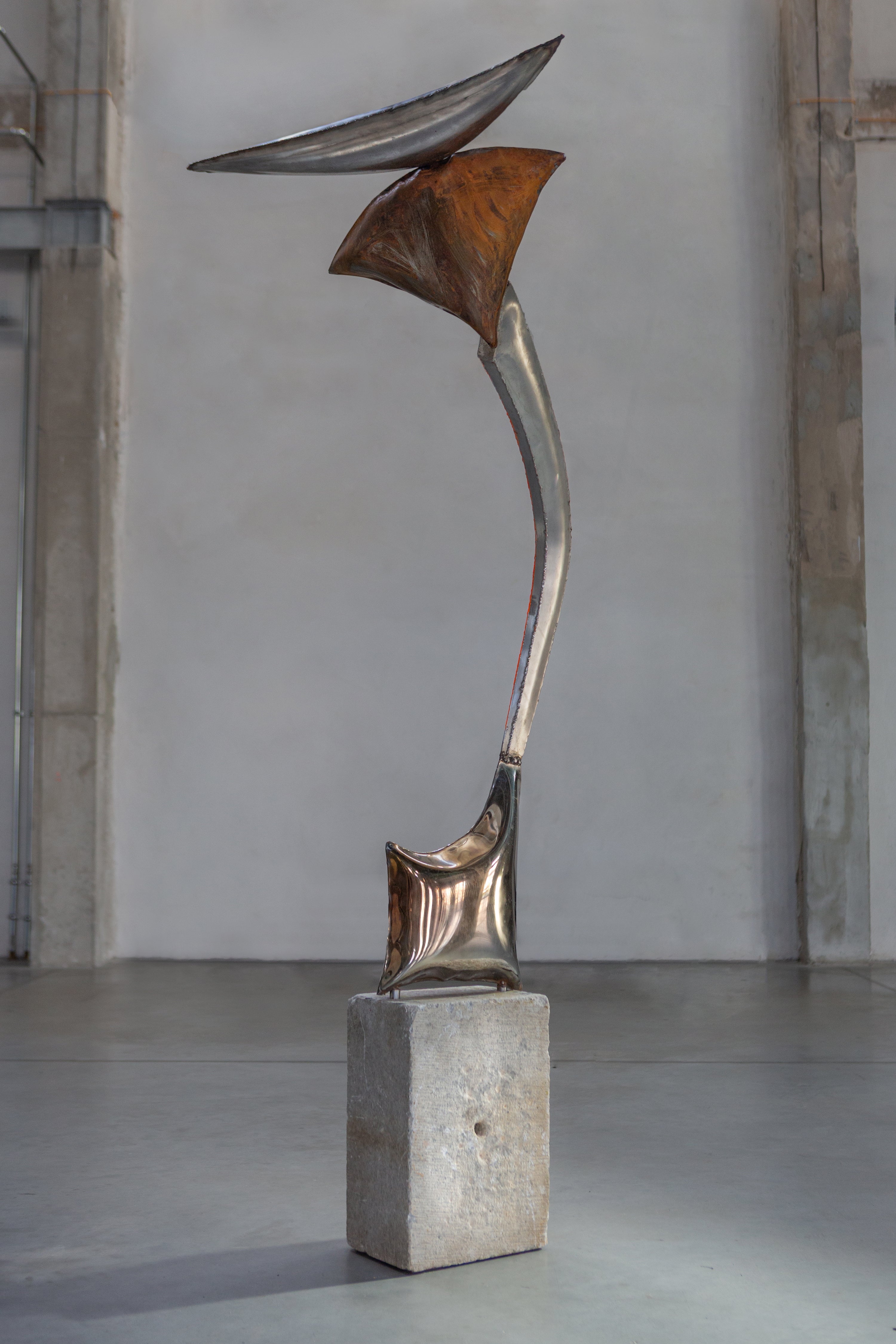 Jakub Trajter (*1983) is a Slovak sculptor whose work navigates the space between abstraction and realism. Combining traditional techniques such as bronze casting and steel welding with contemporary methods like 3D printing, his sculptures reflect on human existence—merging material and spirit into striking, contemplative forms.